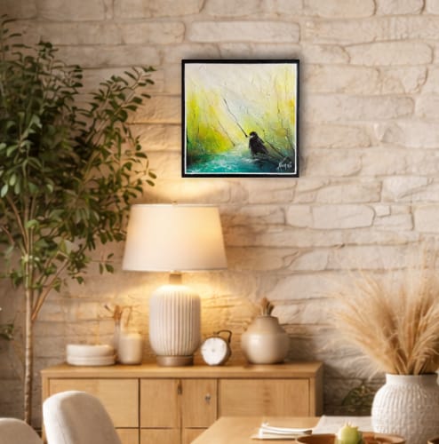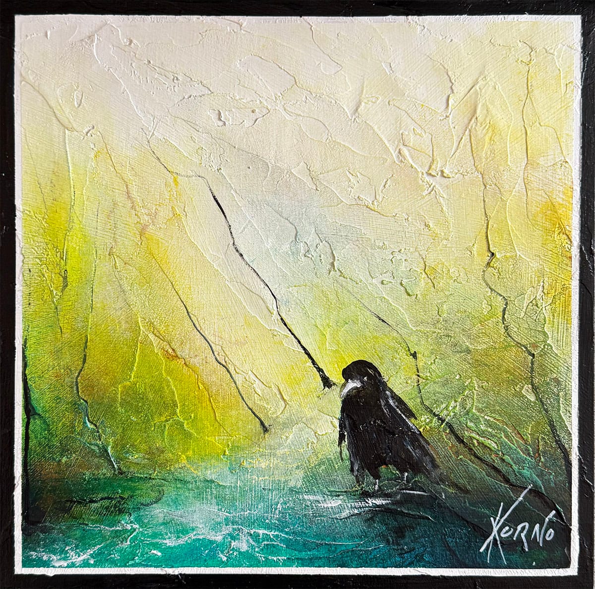 Baignade du corbeau de Korno, Guy Corneau peintre, est une œuvre contemporaine de petit format (12 × 12 pouces), réalisée à l’acrylique sur bois. La composition met en scène un corbeau posé près d’une zone d’eau, comme surpris dans un moment de pause. Autour de lui, une lumière jaune-vert diffuse envahit l’espace, tandis que des blancs texturés et des lignes sombres verticales suggèrent un paysage ou une végétation effacée. L’image reste volontairement ouverte : on reconnaît la présence de l’oiseau, mais tout le décor demeure atmosphérique, entre silence et mouvement.