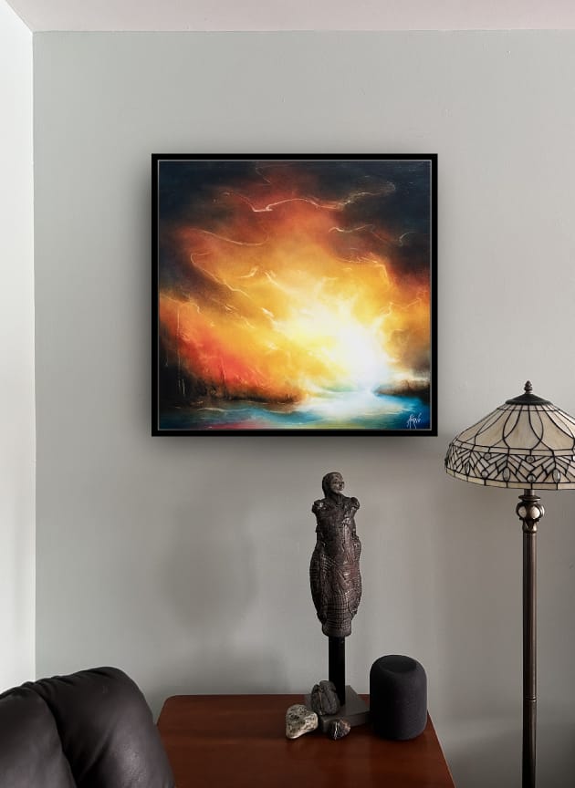 Tableau semi abstrait, Colère de Korno, peintre Canadien, capte une énergie en mouvement, portée par une palette chaude et lumineuse. Les rouges et ocres s’ouvrent sur une zone de lumière intense, tandis que les profondeurs plus sombres structurent l’ensemble et installent une sensation de calme.