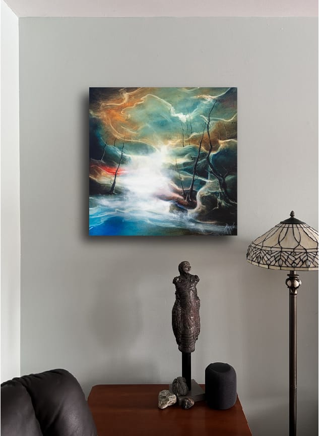Oeuvre de Korno, peintre Canadien, Dénudé évoque une rive silencieuse, traversée par le mouvement de l’eau et la verticalité d’arbres dépouillés. Les bleus profonds et les verts froids s’ouvrent sur une lumière centrale, comme une respiration au cœur du paysage.