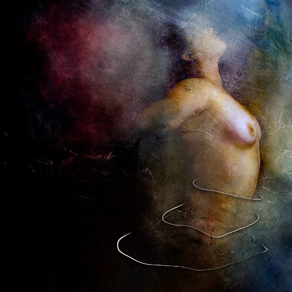 L’image repose sur un équilibre subtil entre présence charnelle et effacement. Les textures superposées, les voiles, les frottés et les zones de brume donnent à la composition une qualité picturale très riche. Une ligne claire serpente au bas du corps comme un souffle ou un rythme, renforçant l’idée de danse, de pulsation, de tension maîtrisée. L’ensemble ne décrit pas une scène: il suggère un état, une intensité, une montée.